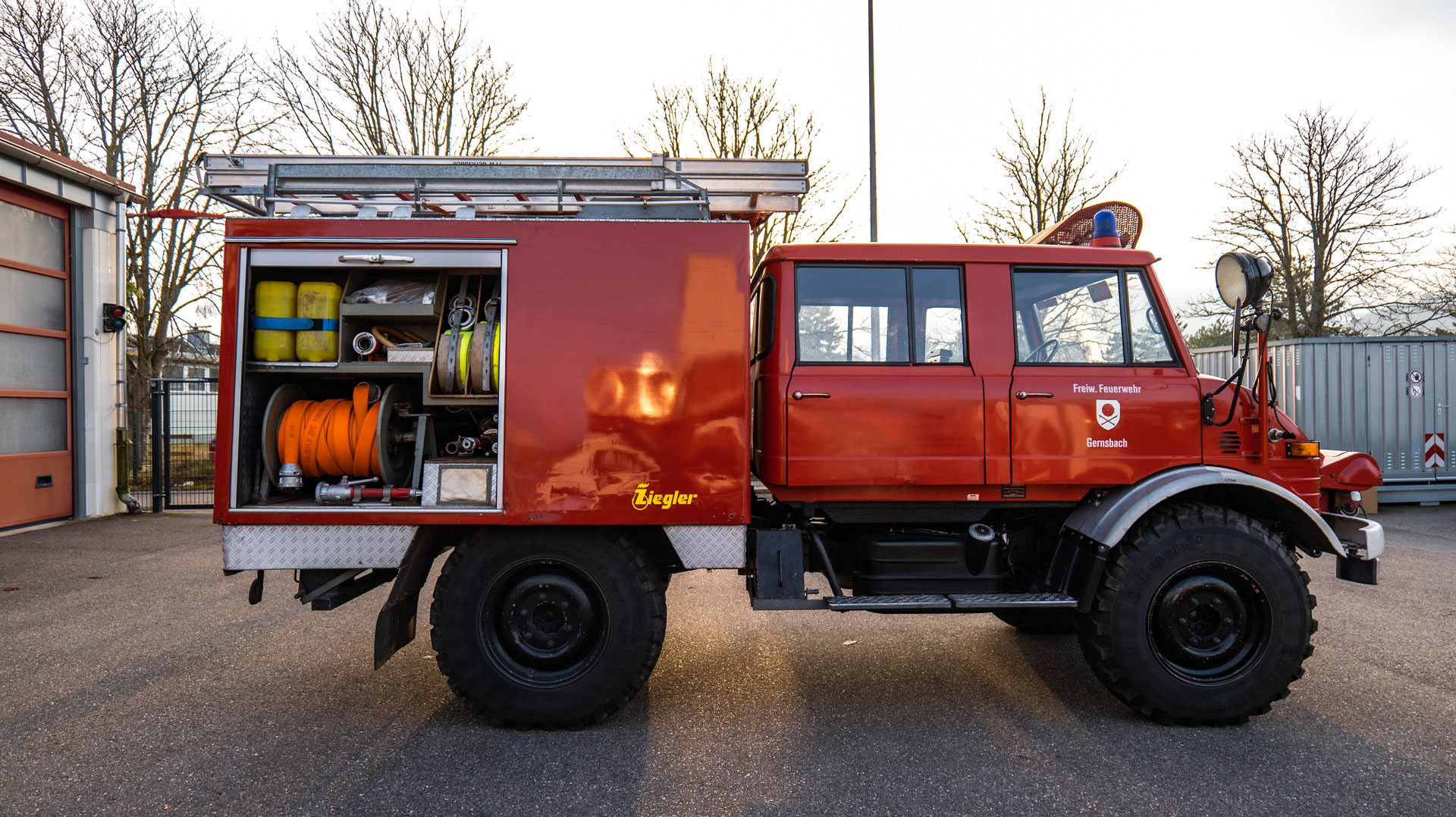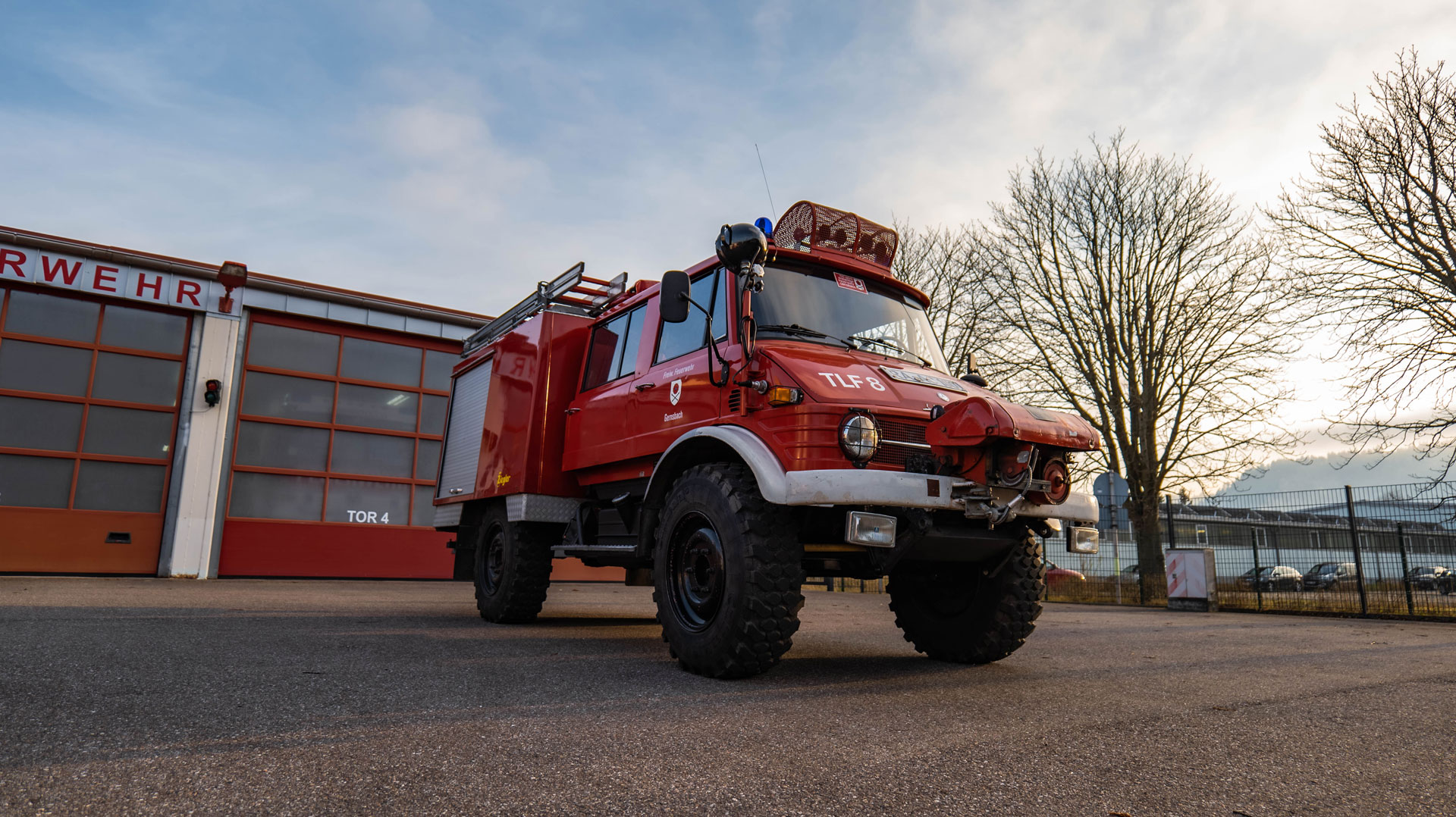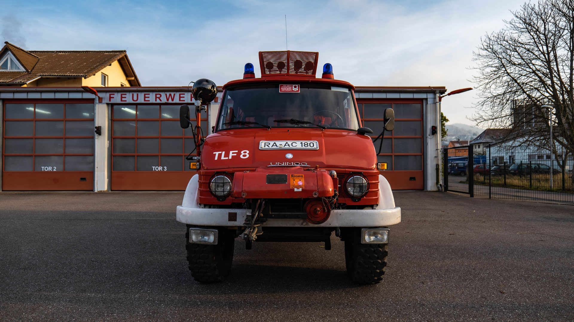 Der Oldtimer aus dem Jahr 1976 ist noch im Einsatzdienst. Das Tanklöschfahrzeug als Unimog ist hochgeländegängig. Durch die vorgebaute Seilwinde lässt sich dieses Fahrzeug auch bei technischen Hilfeleistungen einsetzen.