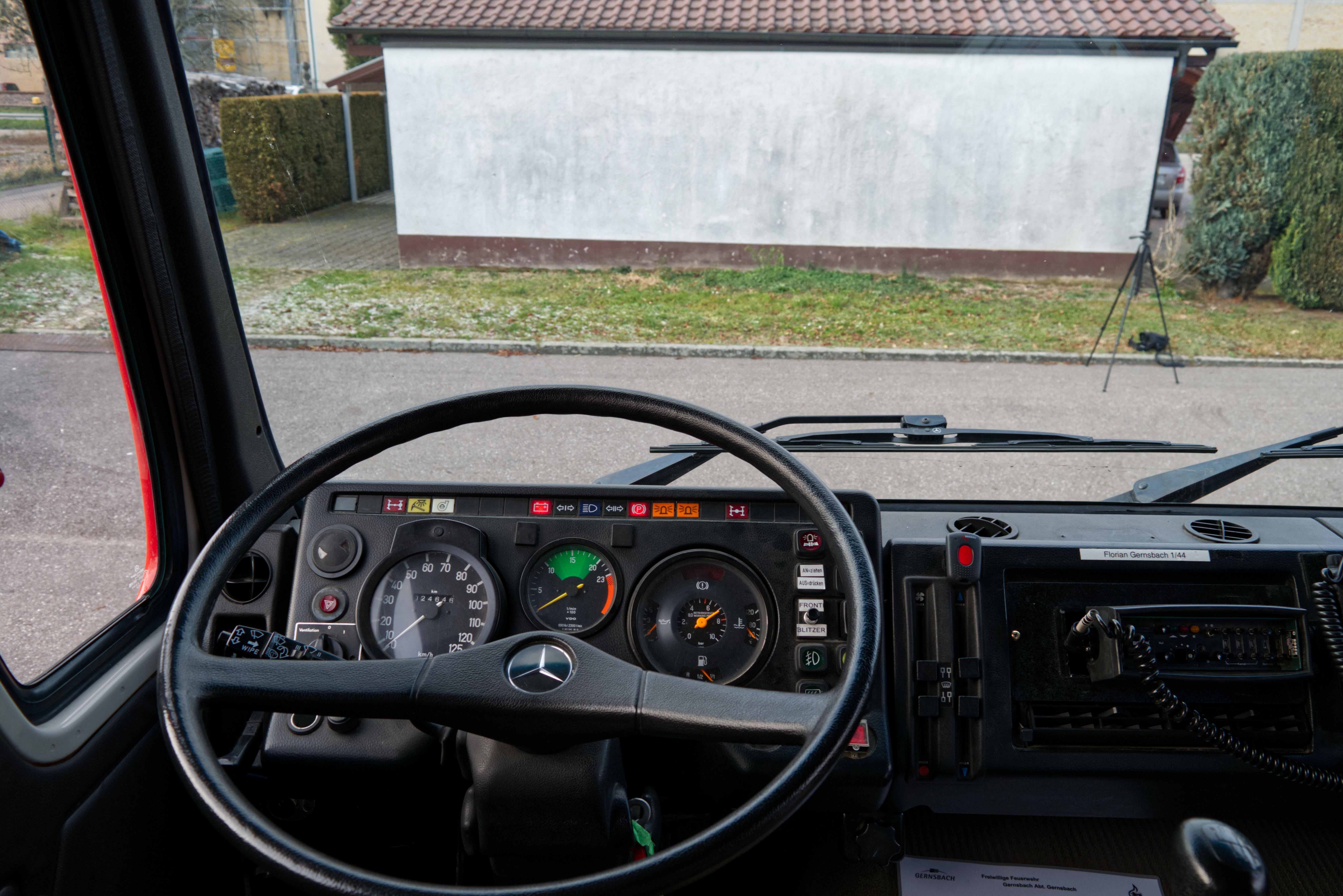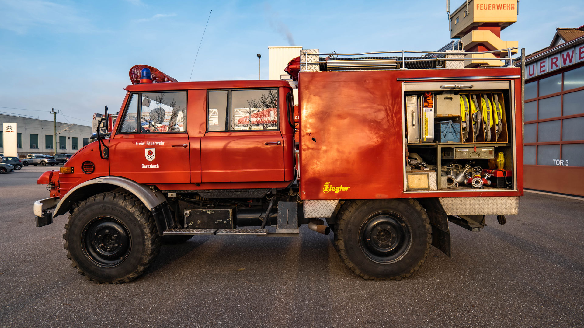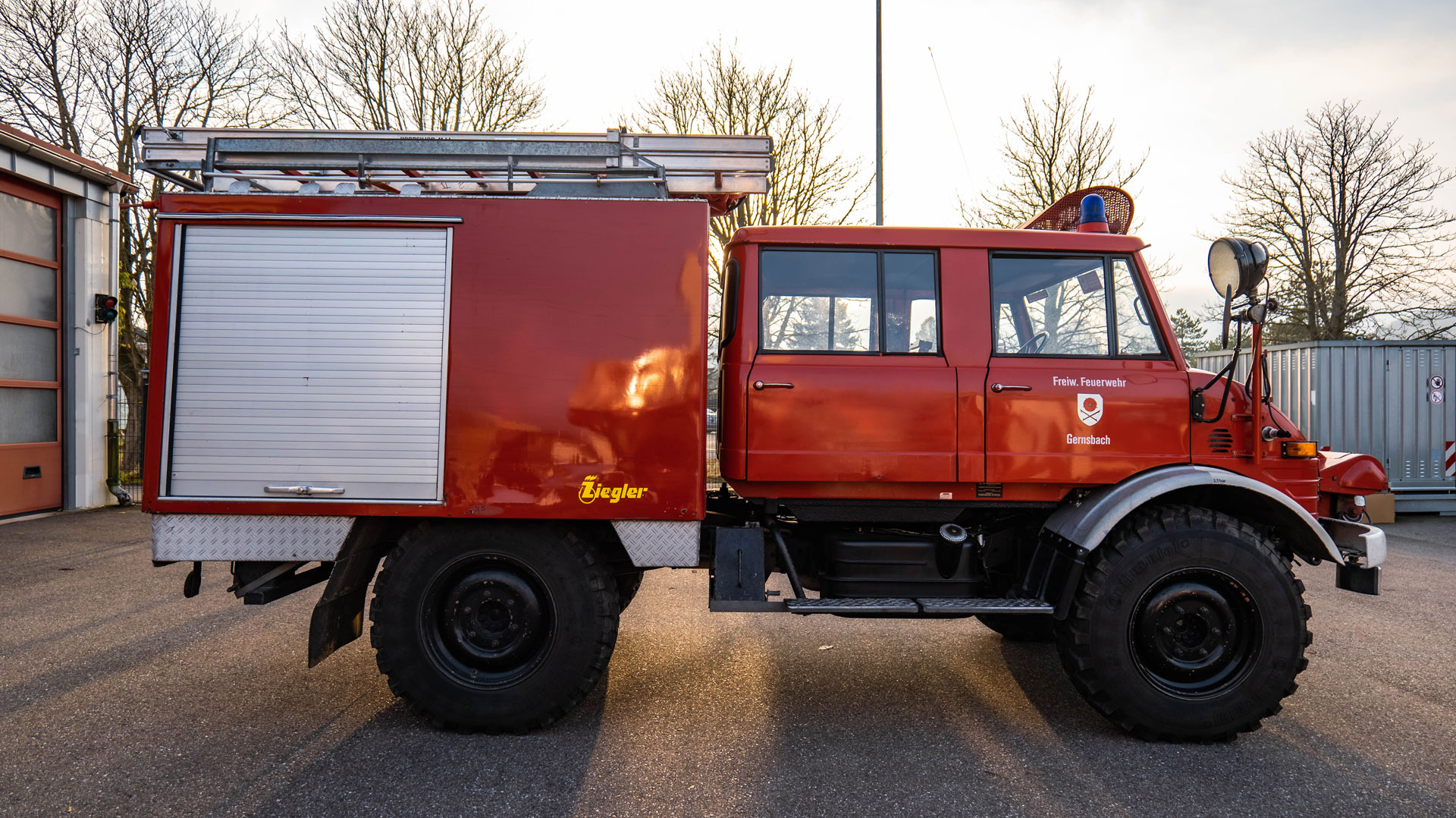 Der Oldtimer aus dem Jahr 1976 ist noch im Einsatzdienst. Das Tanklöschfahrzeug als Unimog ist hochgeländegängig. Durch die vorgebaute Seilwinde lässt sich dieses Fahrzeug auch bei technischen Hilfeleistungen einsetzen.